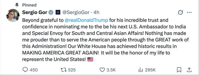戈尔当天在社交媒体上发文,感谢特朗普的提名,称出任美国驻外大使将是其“毕生荣幸”。他还将这条帖文置顶。
